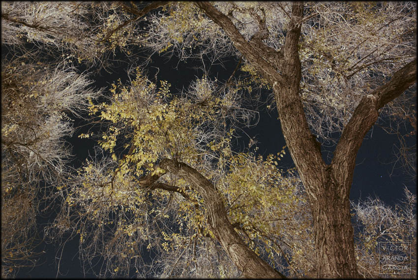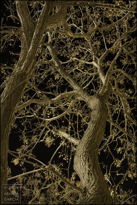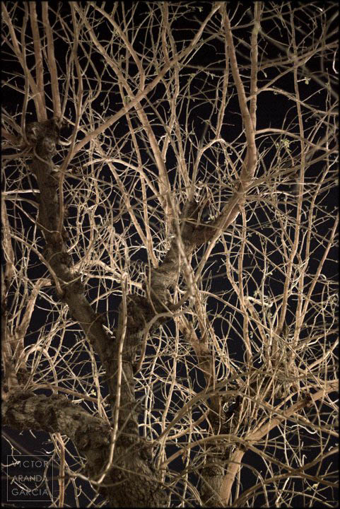 Serie de fotografí­a de naturaleza, árboles en el entorno urbano bajo la luz de las farolas de la ciudad de noche