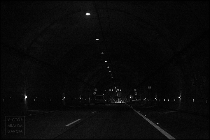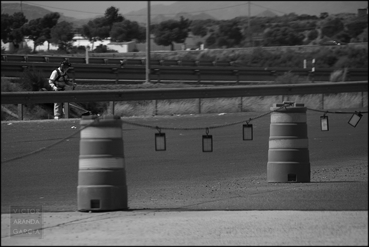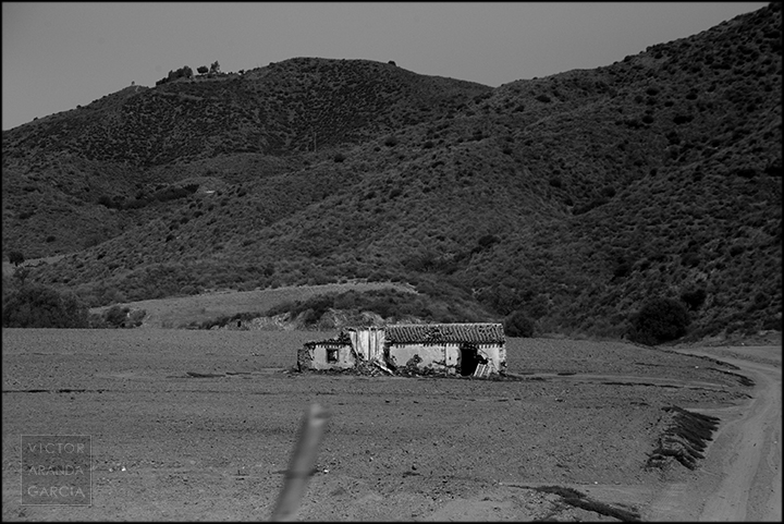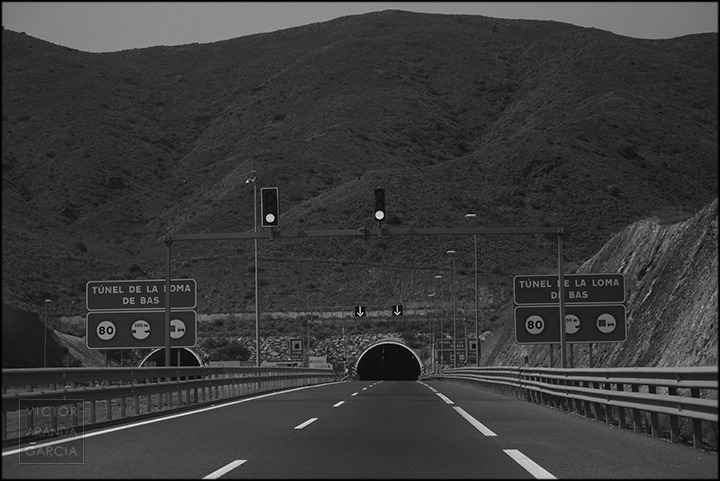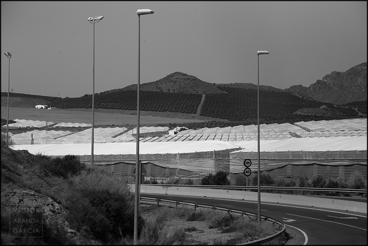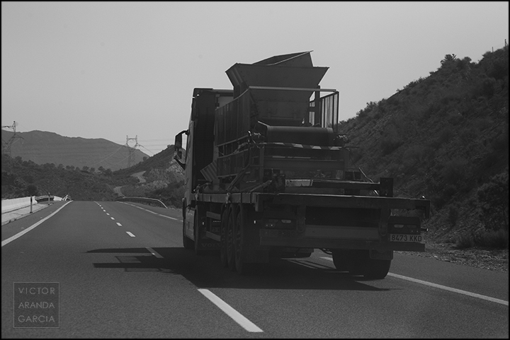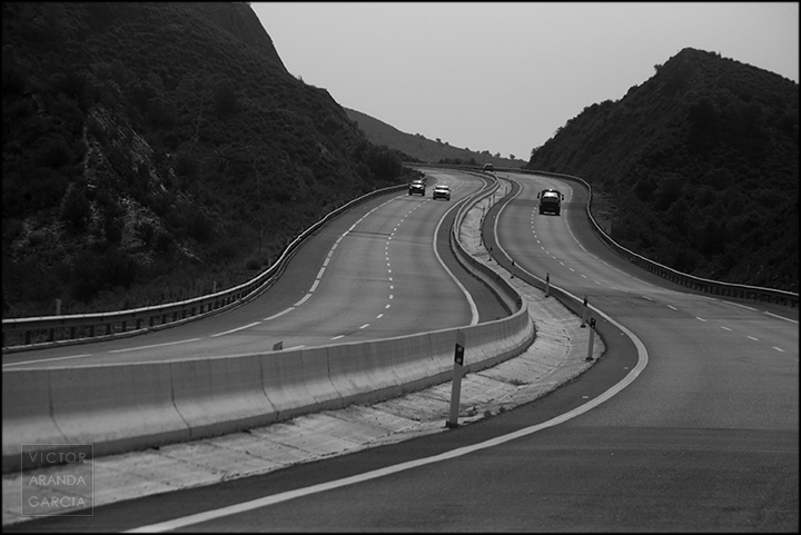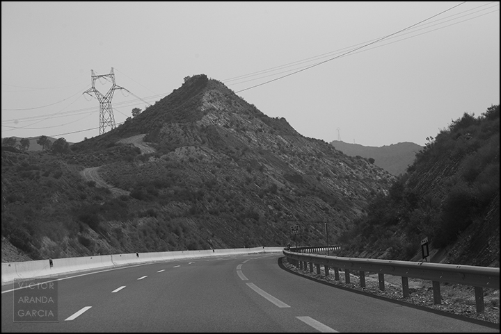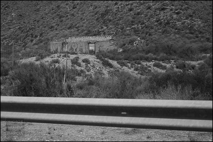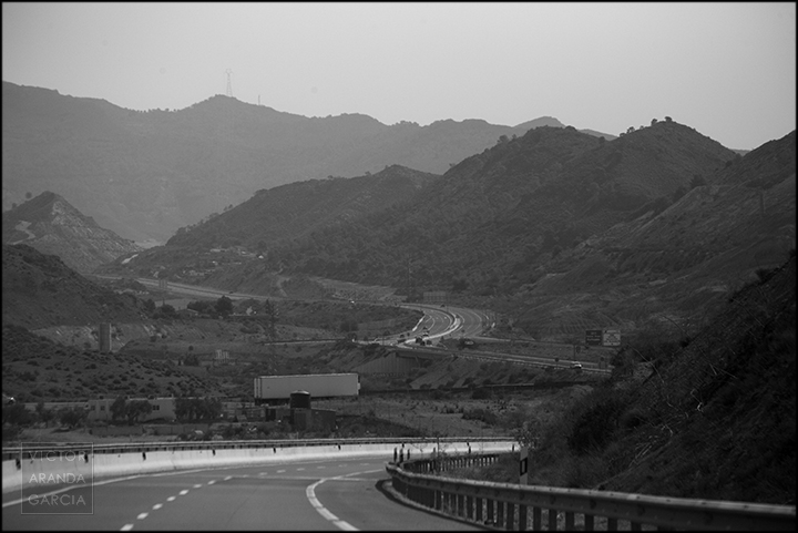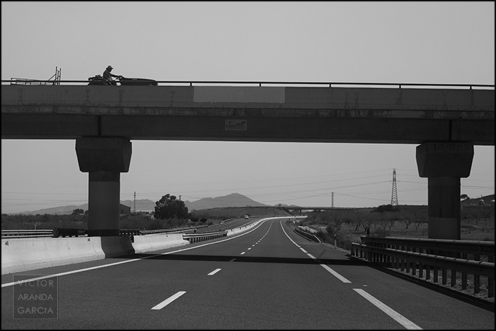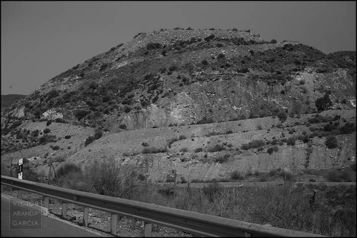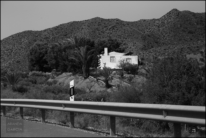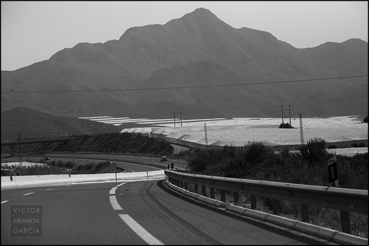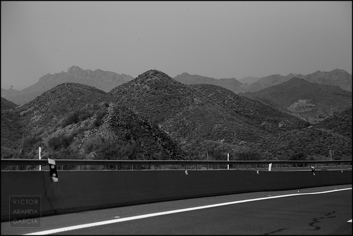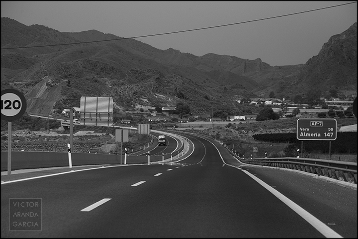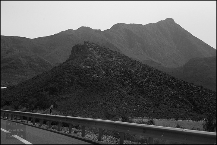 23 fotografías en blanco y negro tomadas desde un coche en marcha en ruta entre Murcia y Águilas el 30 de julio de 2024.