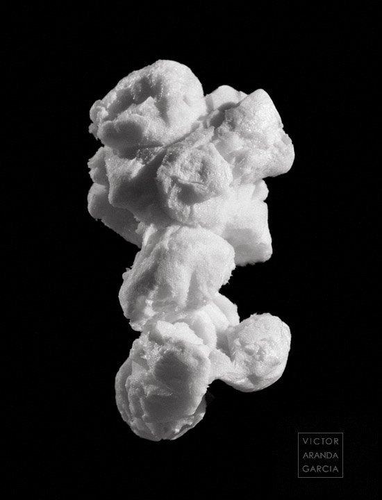 Serie de fotografí­a en blanco y negro realizada en estudio con palomitas de maí­z sobre fondo negro
